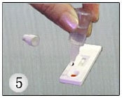在加入血液后2秒鐘后,加入1滴緩沖液,防止血液凝固。血樣和緩沖液加入后即可看到擴散反應,會慢慢流過觀察區(qū)。 一般5分鐘后,混合液已流入觀察區(qū)(檢測區(qū)和對照區(qū))。流動中的紅暈是正?,F象。(圖5)